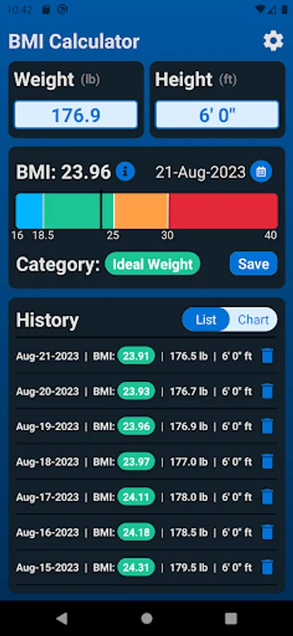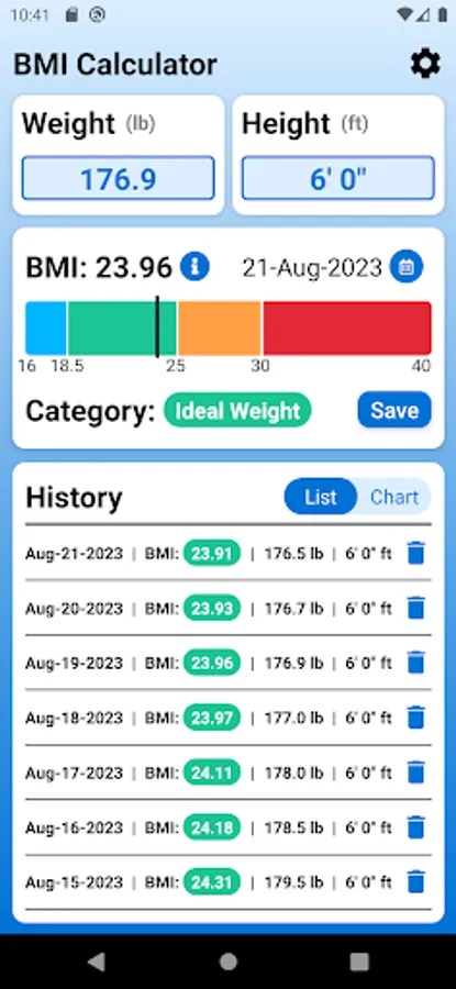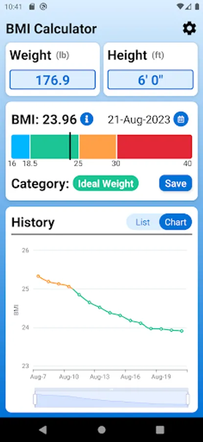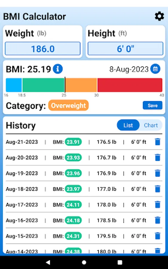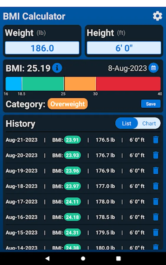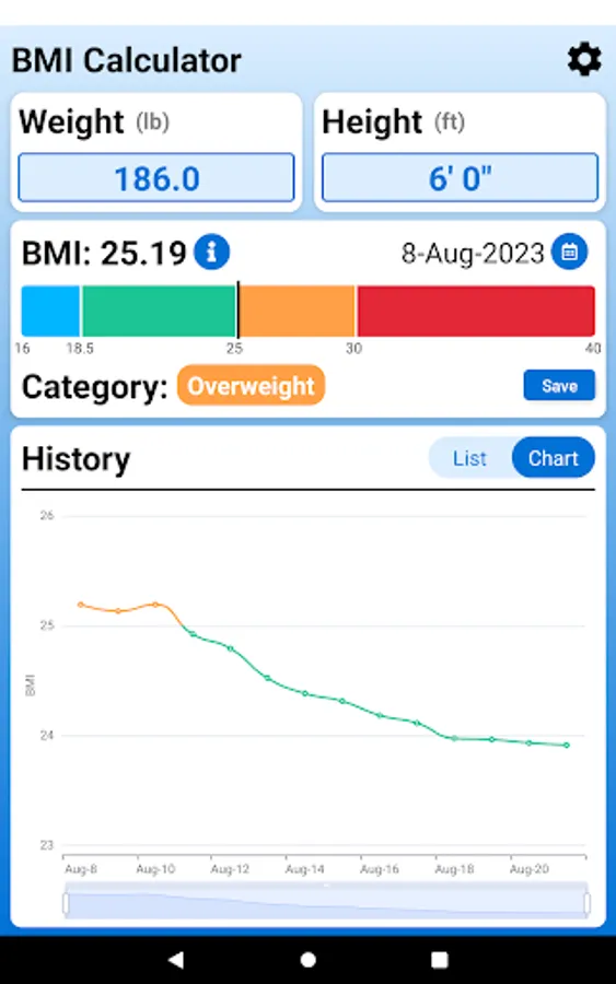 Track Your Progress: Whether you're working towards weight loss, muscle gain, or maintaining your current physique, tracking your progress is crucial. Our BMI Calculator App allows you to input your data regularly and visualize your journey through an easy-to-read chart. Witness your accomplishments and stay motivated to reach your health goals.