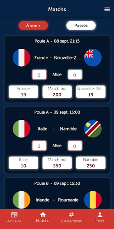 With RugbX, you have the possibility to bet on all the matches of the Rugby World Cup 2023 in France. In two clicks, designate your winners of the group matches, and later those of the final stages.