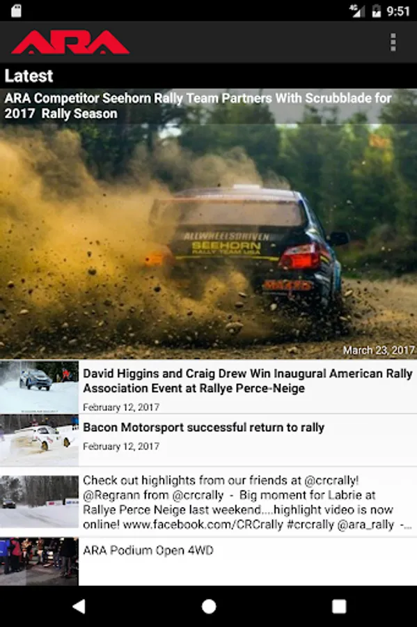 The source for all your American Rally Association event content. Live video, scores, car tracking, event countdown, news, spectator guides and more is all available on this app. Follow US rally easier than ever before with the ARA Rally App, the only app for rally in the US.