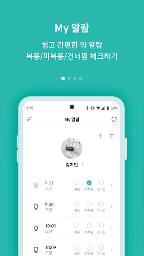 -쉽고 간편한 약 알람 설정하고, 복용/미복용/건너뜀 체크하기