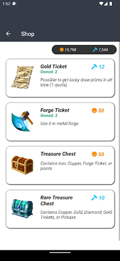 Elemental axes can be purchased in the app. The VIP subscription offers player multiple benefits, which significantly increase mining efficiency. For example, mining speed doubled, 2 more miners can be hired, daily gifts, etc.