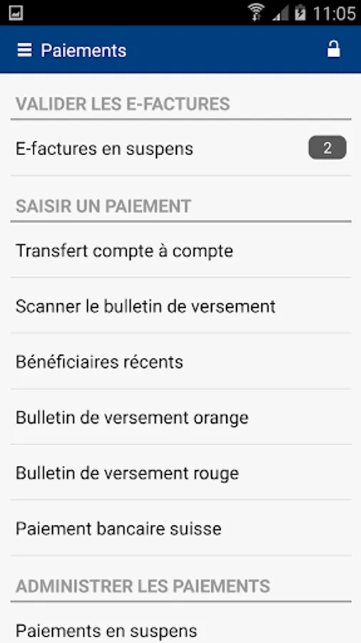 • Saisir vos paiements (paiement en Suisse uniquement, transfert de compte à compte, gérer les e-factures)