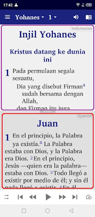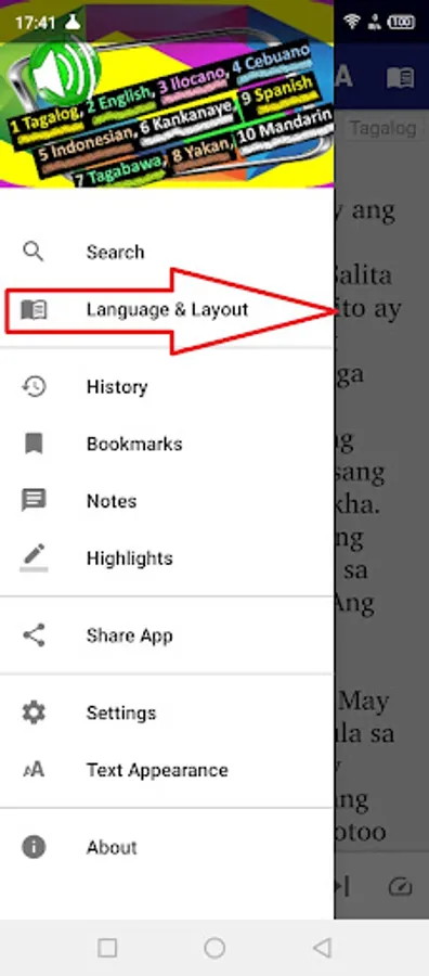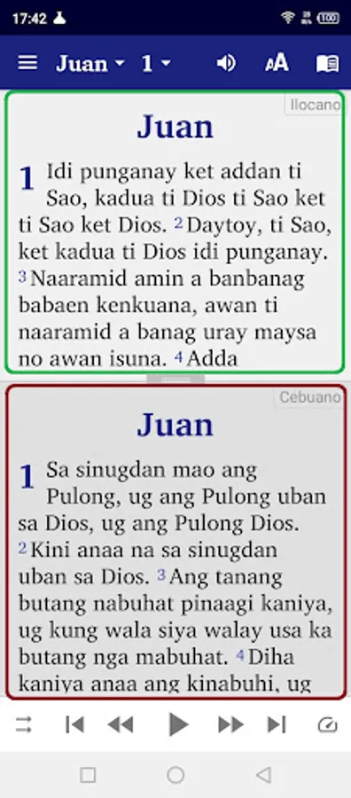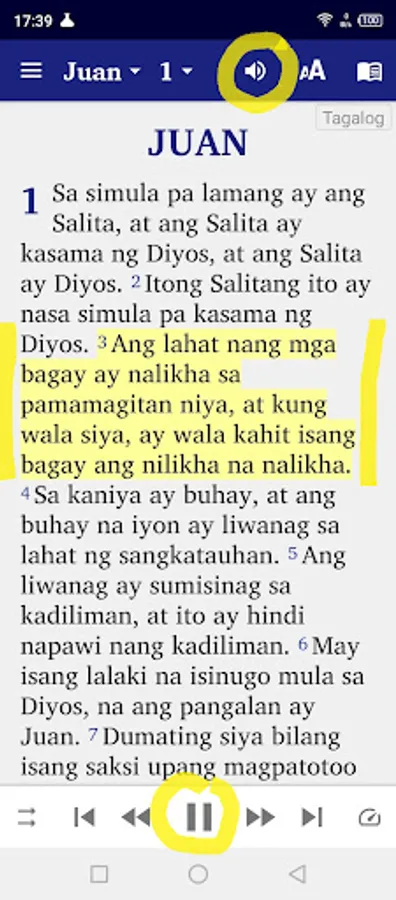 - "verse by verse" to display a verse in Tagalog followed by the same verse in English, Ilocano, Cebuano, Indonesian, Kankanaye, Spanish, Tagabawa, Yakan, Mandarin