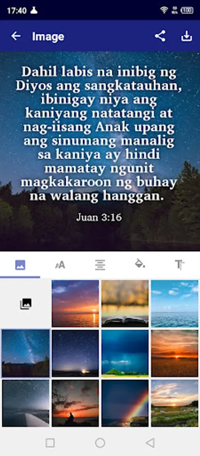 • When you tap on a verse, an image button is shown on the bottom toolbar. When this button is pressed, the 'Edit image' screen appears. You can choose the background image, move the text around the image, change the font, text size, alignment, format and colour. The finished image can be saved to the device and shared with others.