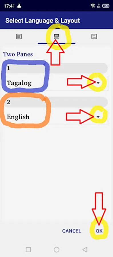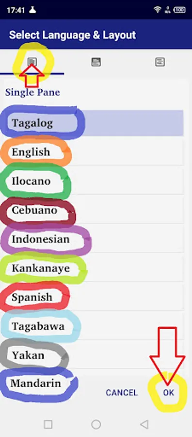 - "two panes" to display the Tagalog at the top and the English, Ilocano, Cebuano, Indonesian, Kankanaye, Spanish, Tagabawa, Yakan, Mandarin version at the bottom