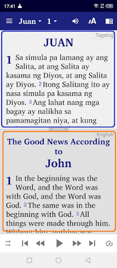 This App contains the Tagalog Bible text with audio for the New Testament which can be downloaded chapter by chapter (if you give the permission). In parallel you can share the screen and combine any of the 9 other languages with another language of yur choice. For example Tagalog on the upper half and English on the lower half of your screen.