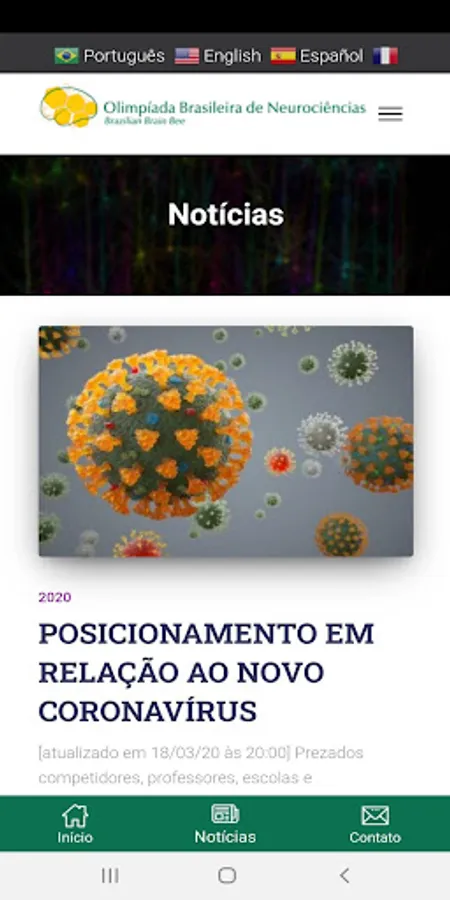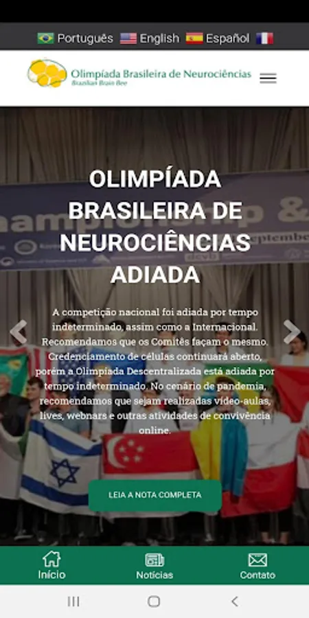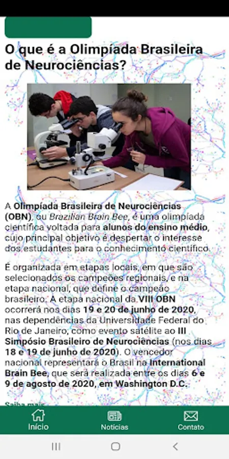With the app of the Brazilian Neuroscience Olympiad (Brazilian Brain Bee), the user stays on top of the main news about the competition, dates and important events, follow results and seek all the information to register or set up a local committee to carry out the proof.