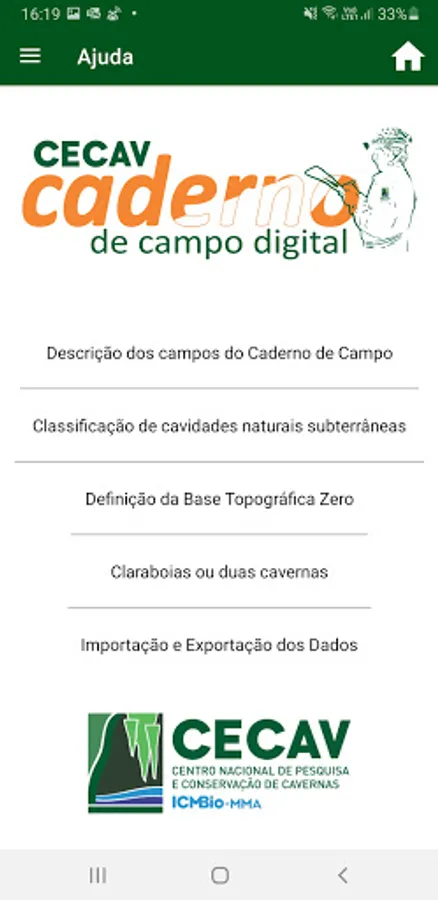 The Digital Field Notebook is a cave characterization and validation application that has an internal database, making it possible to use it even without access to the internet. The tool, available in the Android version, seeks to facilitate field activities in Brazilian caving.