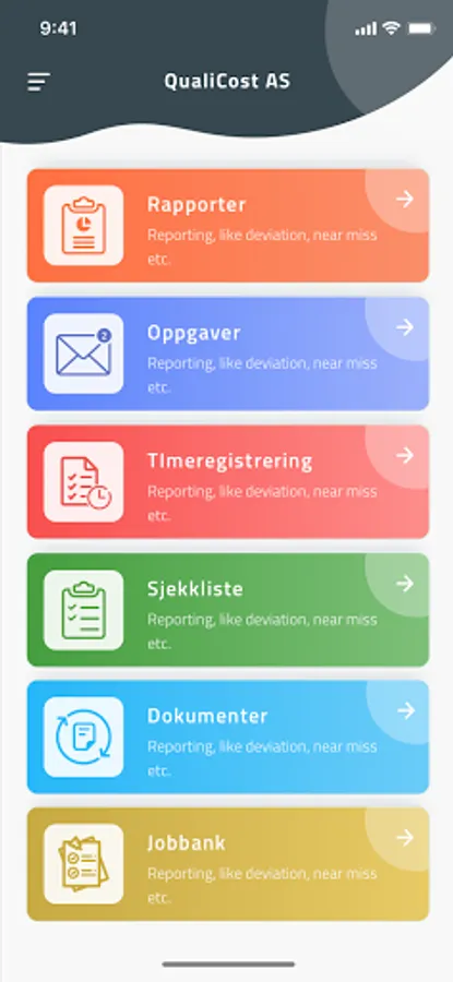 Multipurpose tool for HSEQ-reporting, Checklists, Timesheet and tasks. The app is seamlessly integrated with the quality system QualiCost Management System, where you can follow-up and process registrations from the app.