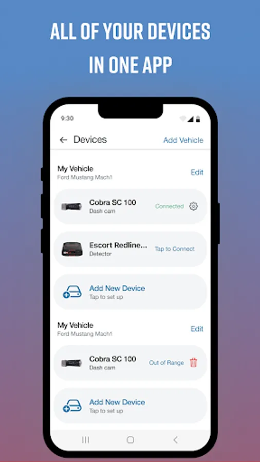 A streamlined onboarding process lets you quickly connect your Dash Cam and configure it as part of your dashboard. You can "add" a virtual vehicle to your account, then add compatible* Cobra and Escort branded devices to your vehicle.