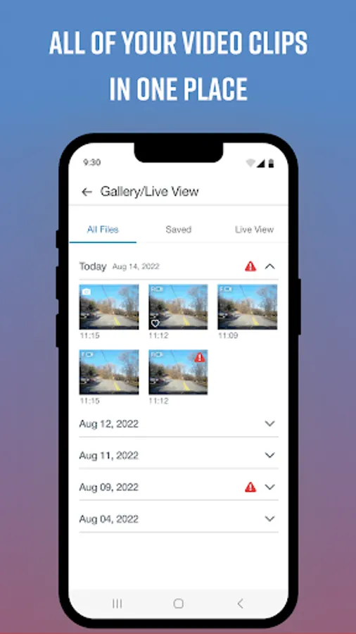 View recordings stored on your Dash Camera SD card; recordings are conveniently sorted by timeline which highlights events of importance; such as possible collisions or impact. Select files to download to your phone; trim video clips and share with your contacts using your favorite communications app.