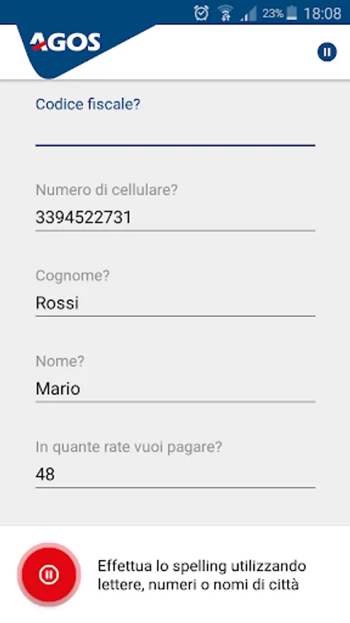 The application requests in sequence, by means of the system vocal synthesis, the insertion of the data necessary for the request for a loan. Through voice interaction, the chatbot fills out the form.