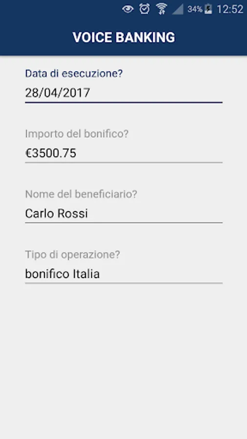 Voice Banking Demo is a native demo app for the Android platform created as a feasibility study for an entirely vocal compilation of an internet banking request.