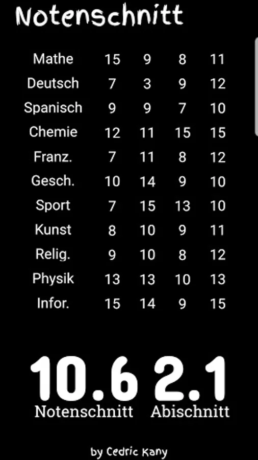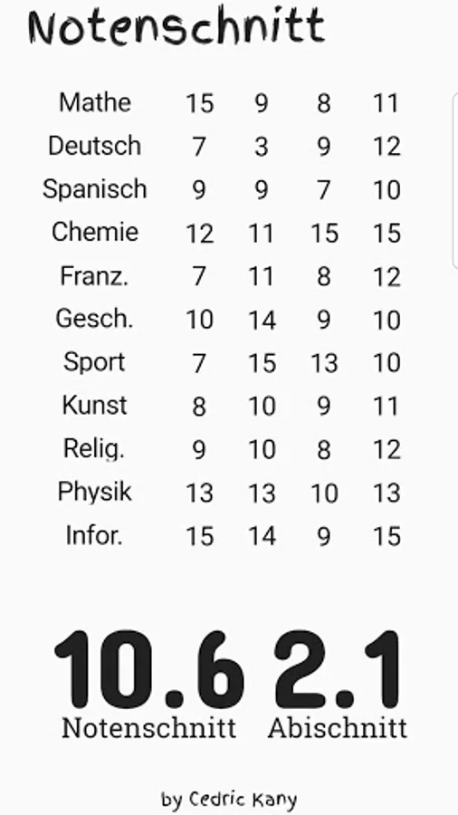 The app is suitable for advanced level. All grades of the last 4 semesters can be entered in it and the grade point average and the Abitur grade are calculated. Only the fields entered are taken into account. All fields with "-" are evaluated as not available. In order to calculate the grades as precisely as possible, it is necessary to enter all grades from the 4 semesters.