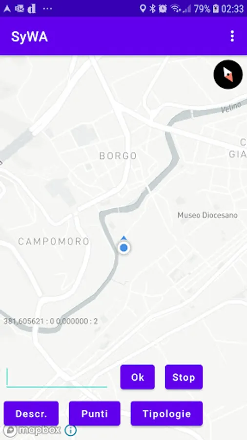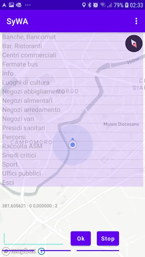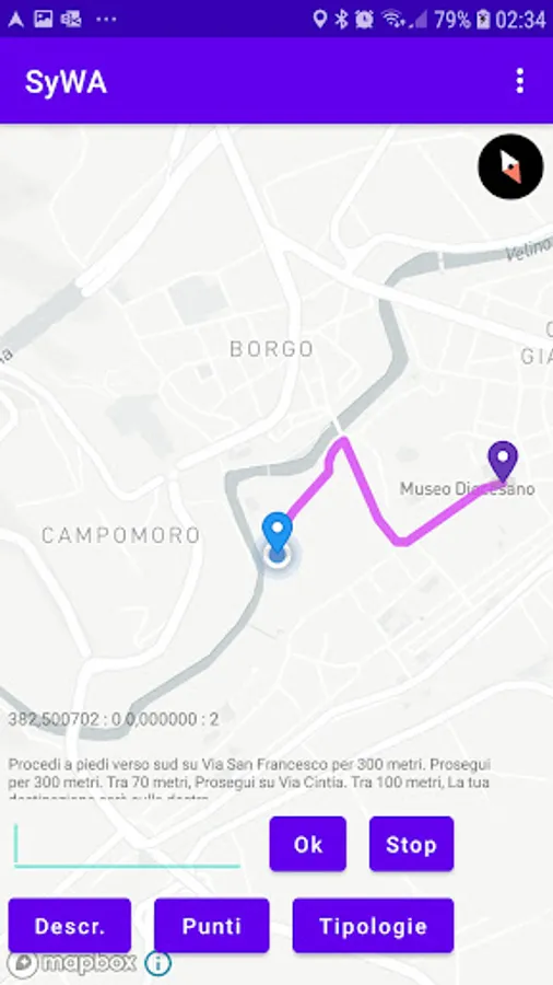 The SyWA app is a navigation utility dedicated to blind people and allows these people to reach the pre-set destination point on foot, providing vocal indications relating to turns and the presence of points along the route, inserted in a server. The destination points can be chosen by explicitly writing the desired street or by selecting points belonging to certain types, for example pharmacies, bus stops, etc. The app also manages points identified by the presence of BLE tags, installed in places of particular interest, such as shops.
