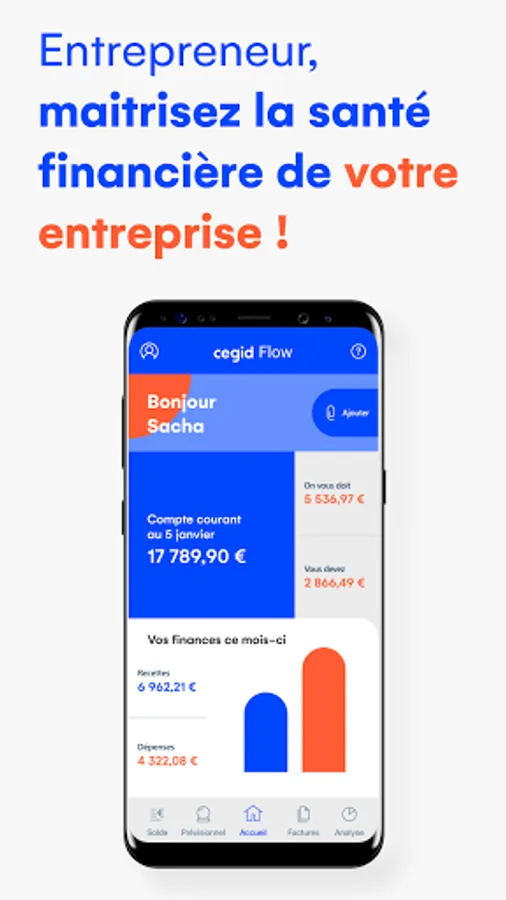 Cegid Flow is designed for entrepreneurs who want to monitor the financial health of their business as it happens, accurately and effortlessly. The objective is to allow them to react more quickly, and when necessary.