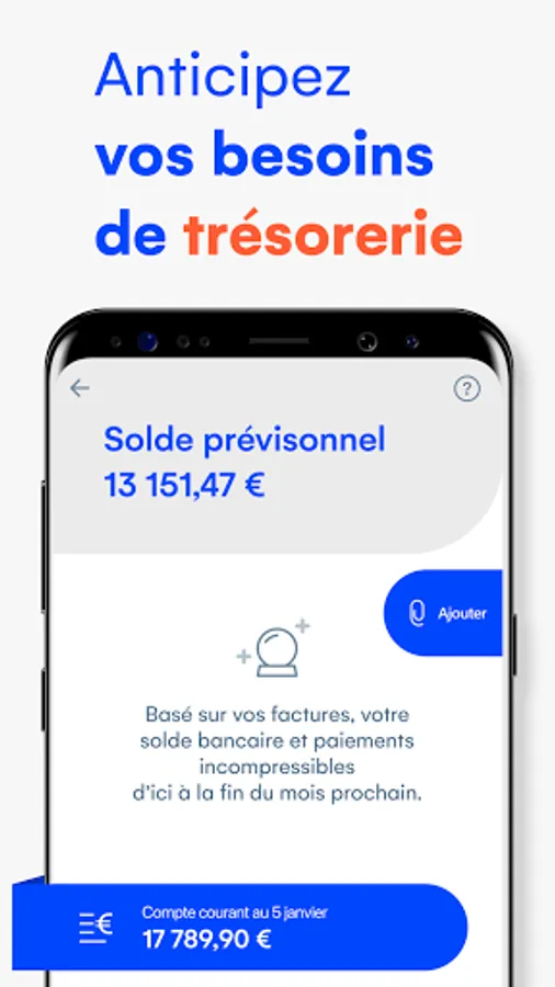 Cegid Flow gives you the projected balance of your company based on your invoices, your bank balance and the incompressible charges (salaries, social charges, taxes). This is how you get a reliable cash flow forecast. You take control of your finances with the help of an intelligent assistant and successfully anticipate your needs.