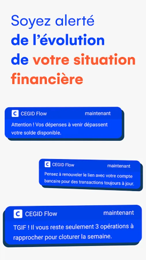 Cegid Flow watches over you every day! An invoice awaiting payment? A drop in cash? A large payment on your account? Cegid Flow alerts you and you move forward with complete peace of mind.