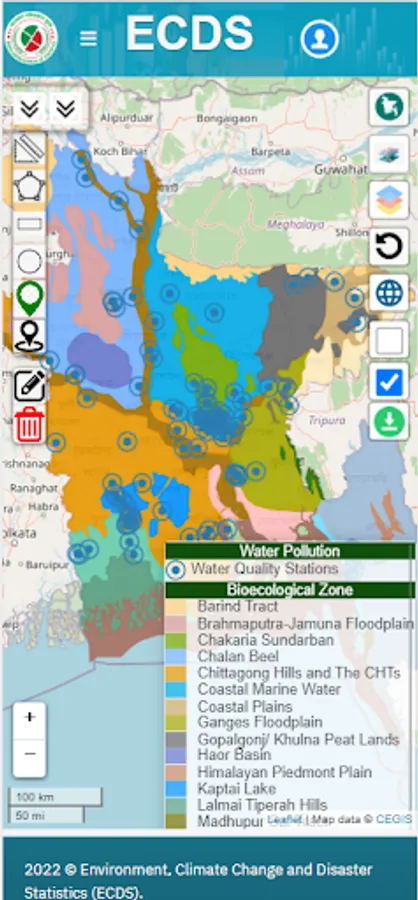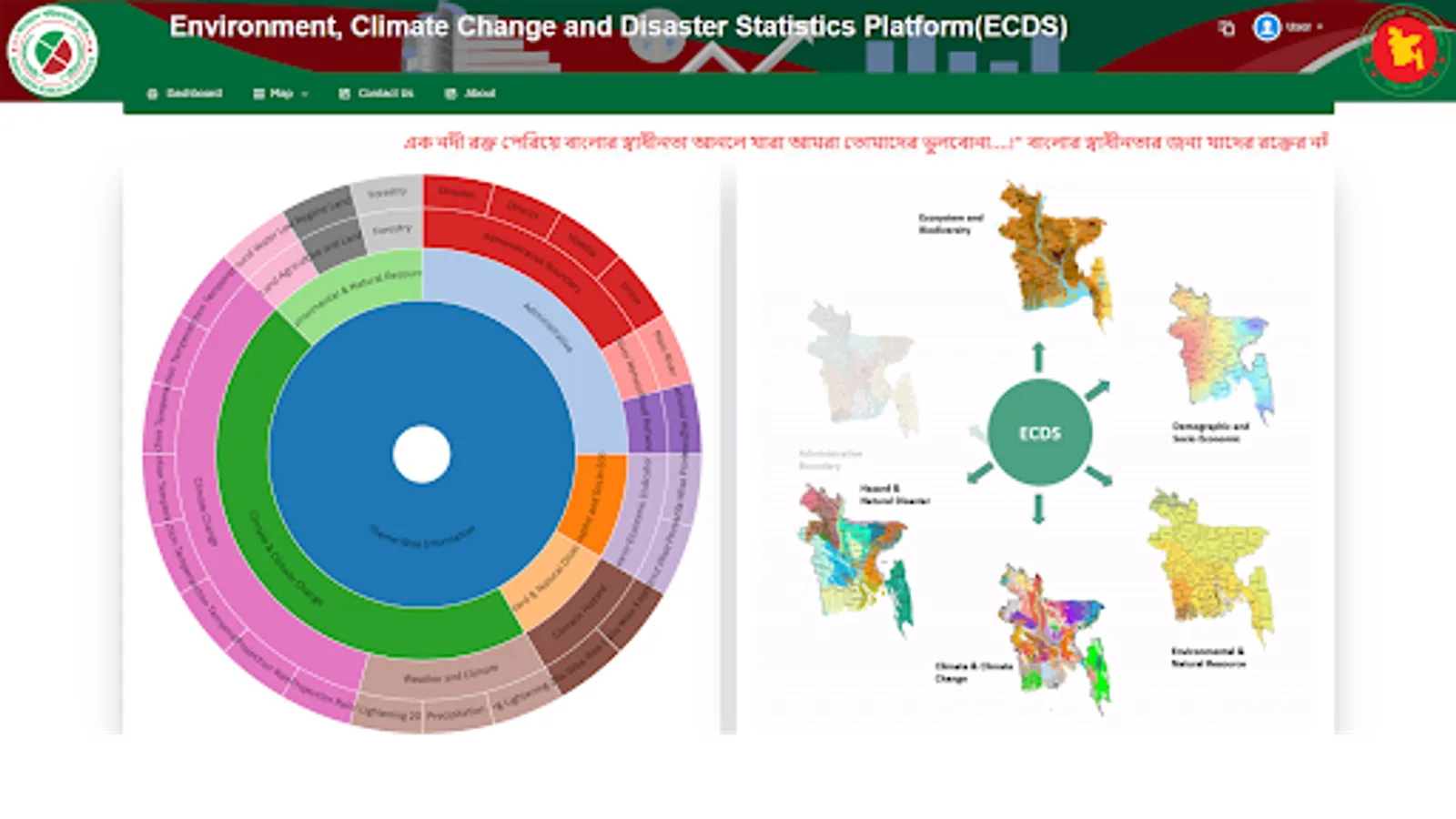 Bangladesh being one of the most disastrous and vulnerable countries due to climate change experiences countless damage and loss of human lives, property, infrastructures etc. each year but continues to move steadily toward the attainment of sustainable development goals (SDGs). Having set an objective to generate environment, natural resources, bio-diversity, climate change and disaster-related statistics for institutionalization of the environmental statistics in Bangladesh, the “Environment, Climate Change & Disaster Statistics (ECDS) Cell” under Bangladesh Bureau of Statistics (BBS) intends to develop a web platform with an integration of all the relevant spatial and non-spatial data and statistics. Centre for Environmental and Geographic Information Services (CEGIS) is responsible for developing this web application in use of advanced tools and techniques. The application is aimed to serve as one stop service and support early career researchers, professionals and policy makers with knowledge. Geospatial data preparation and web application development- are the two major components of this project. Geospatial data integration considers data collection, processing, validation and integration under six themes - administrative, environment and natural resources, climate and climate change, hazard and natural disaster, ecosystem and biodiversity, demographic and socio-economic. Web application development process accommodates ASP .NET Core for front end design, MySQL for database management and Leaflet JS for map representation. The overall process is based on two approaches- end user requirement assessment and collaborative development approach. Theme-based data synchronization in the web interface is intended to facilitate the end-users for data query, and the platform provides security, publicly accessible open-source code, high performance and flexibility for the users. The working package is expected to introduce a smart phone application in both iOS and Android version which will perform similar to the native application.