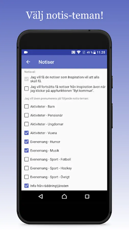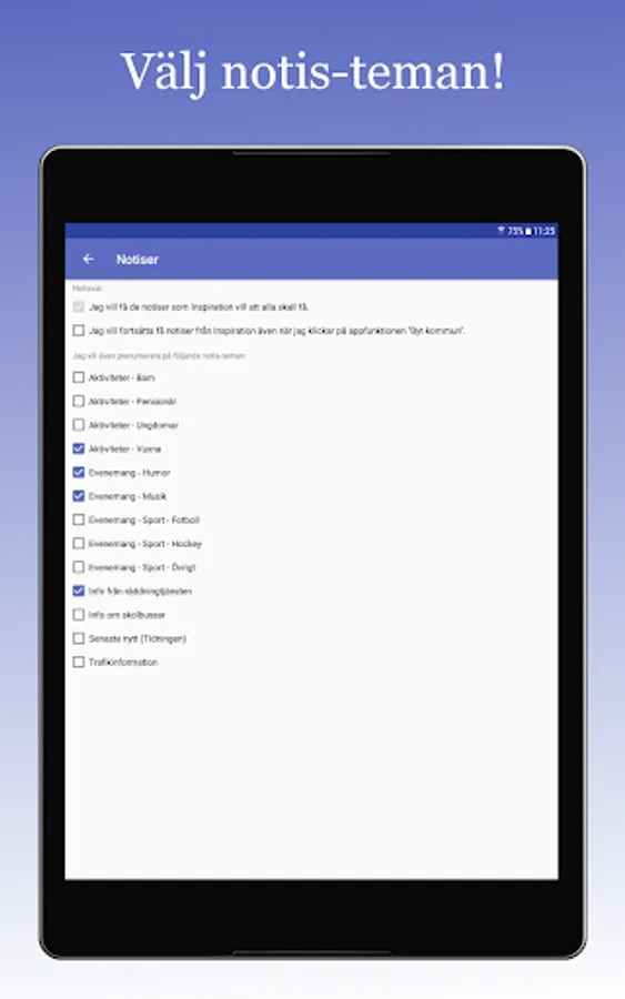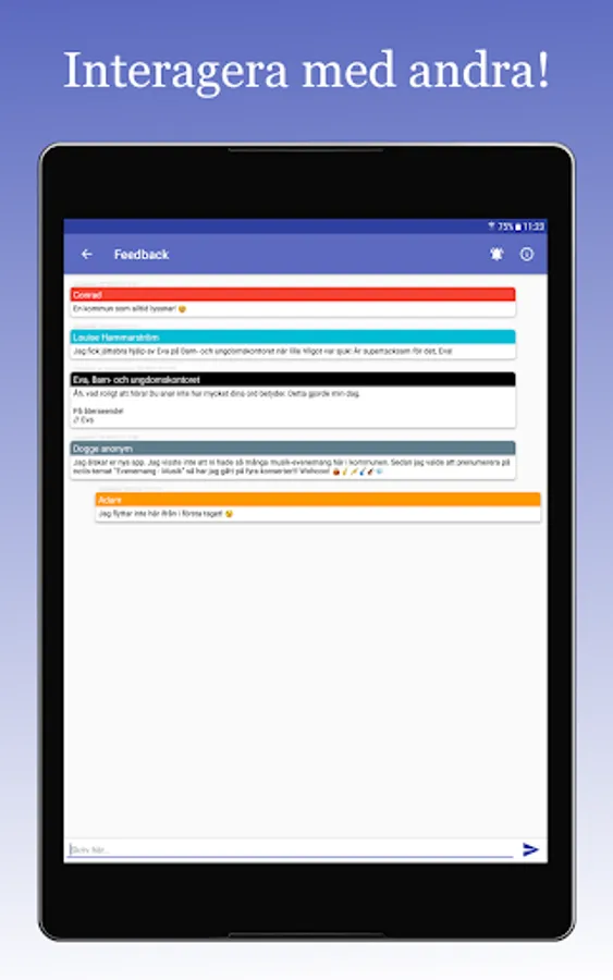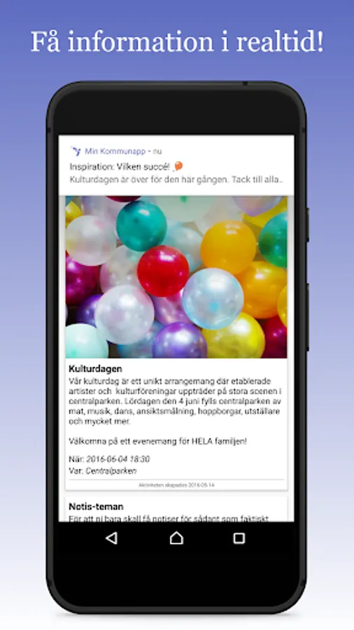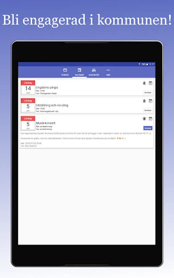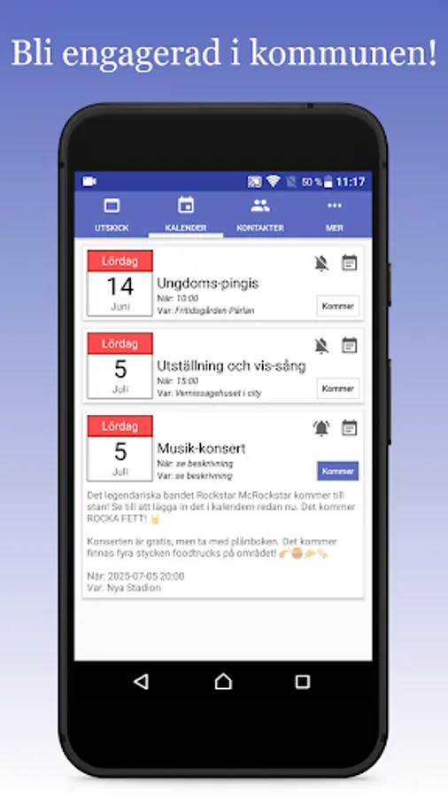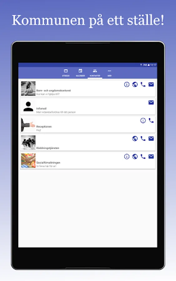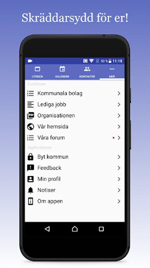 This is the android app where the information is displayed in a neat way for the municipality's residents who possess an android phone. In addition to being able to see mailings, the members have access to a calendar with upcoming events, the municipality's contacts and the functions that the municipality has assisted.
