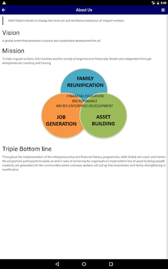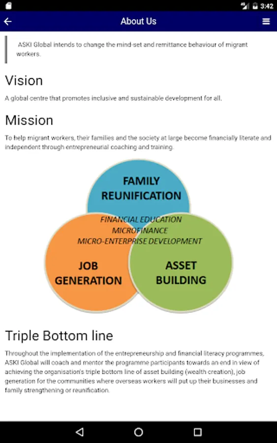 Throughout the implementation of the entrepreneurship and financial literacy programmes, ASKI Global will coach and mentor the programme participants towards an end in view of achieving the organisation's triple bottom line of asset building (wealth creation), job generation for the communities where overseas workers will put up their businesses and family strengthening or reunification.