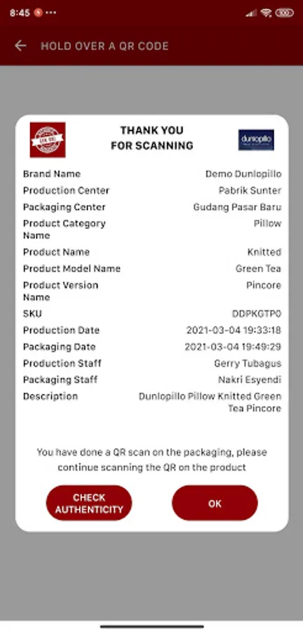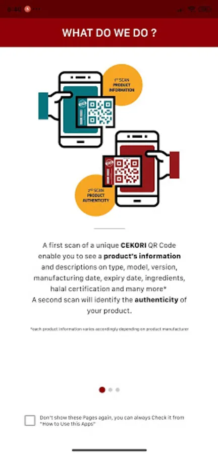 All you have to do is scan the two QR codes and in a few seconds, all 2 scans are uniquely recorded for time, location and who scans it. Privacy and access permissions are used for the sole purpose of authenticity of the particular product. Time and location information are only accessed during QR code scanning process. CekOri never keeps trace of a user’s whereabouts outside of the function of CekOri’s authentication to protect user’s privacy.