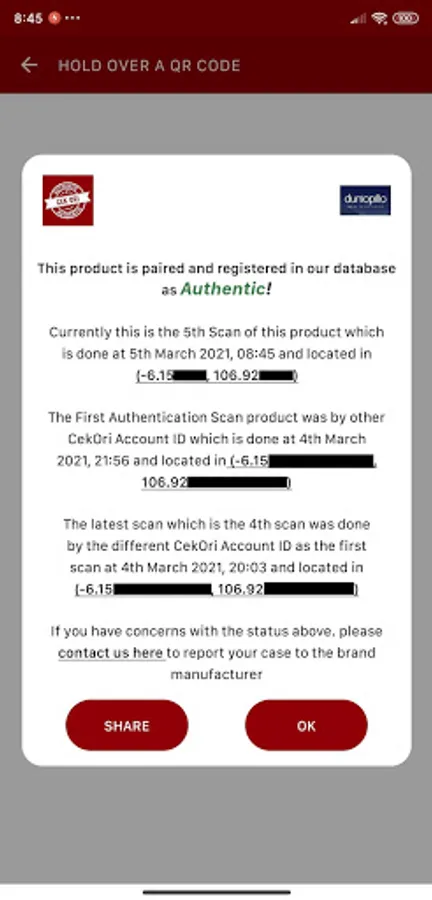2. CekOri raises the bar higher by introducing 2 Factor Authentication, in the form of a less visible second QR code (only accessible by the purchaser owning that particular product). Scanning this second QR code after opening the sealed packaging will further validate the product itself was not tampered or exchanged by checking unique pairing with the first QR on point 1 above. This establishes the first log of the product after it has been opened and will guarantee that you are the first person opening this packaging by pairing the two QR codes. Any deviation of this outcome will be shown as a notification to you, including when, where and by whom the first pairing of the particular product took place. In this case, you can report this suspicious variance with one click directly to the brand manufacturer from the CekOri app itself. No fiddling with forms, serial numbers, complain emails or contacting a customer call centers etc.