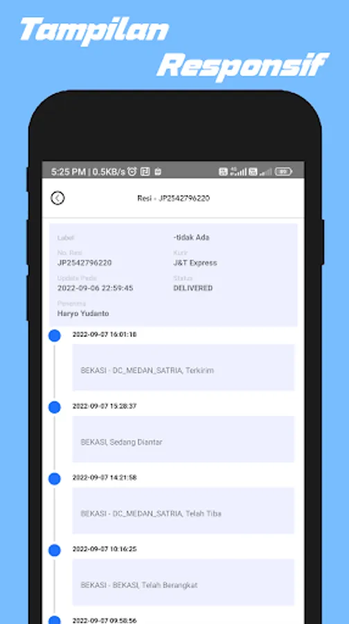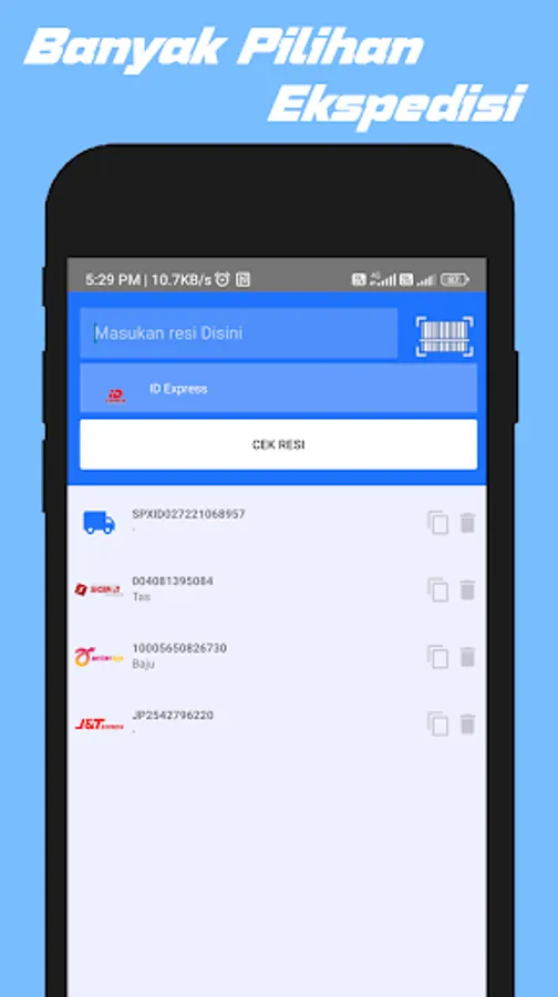 Supported expeditions to check receipts & check postage such as JNE, J&T Express, Anteraja, Ninja Express, JET, TIKI, Wahana, ID Express, Pahala, Pandu Logistics, First Logistics, Lion Parcel, Nusantara Card Semesta (NCS), Pos Indonesia, Expedito, IDL Cargo, Star Cargo, 21 Express, RPX Holding, SAP Express, Royal Express Indonesia (REX), Express Solutions, NSS.