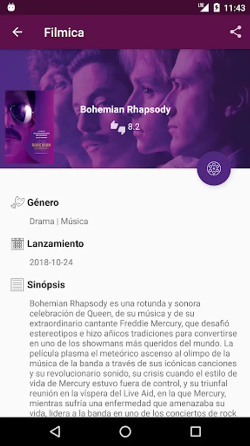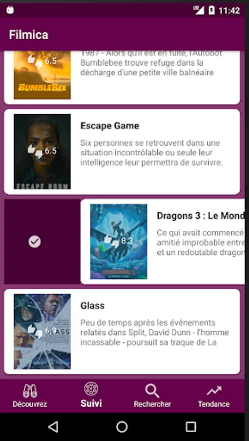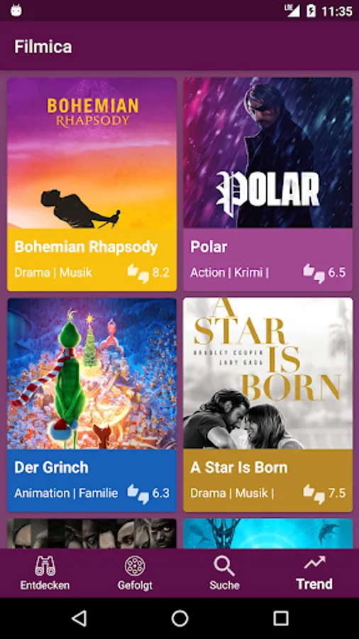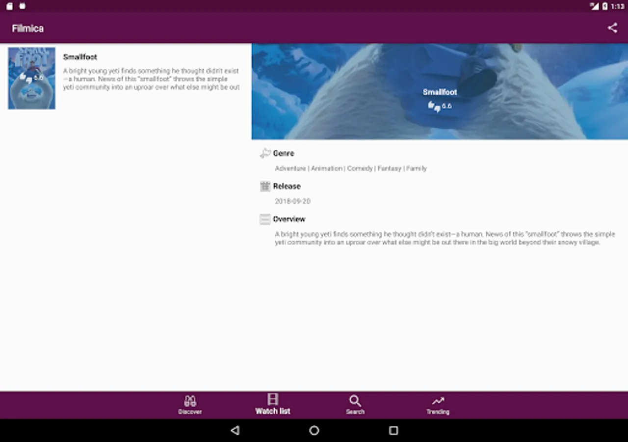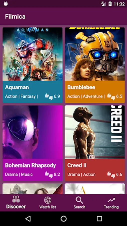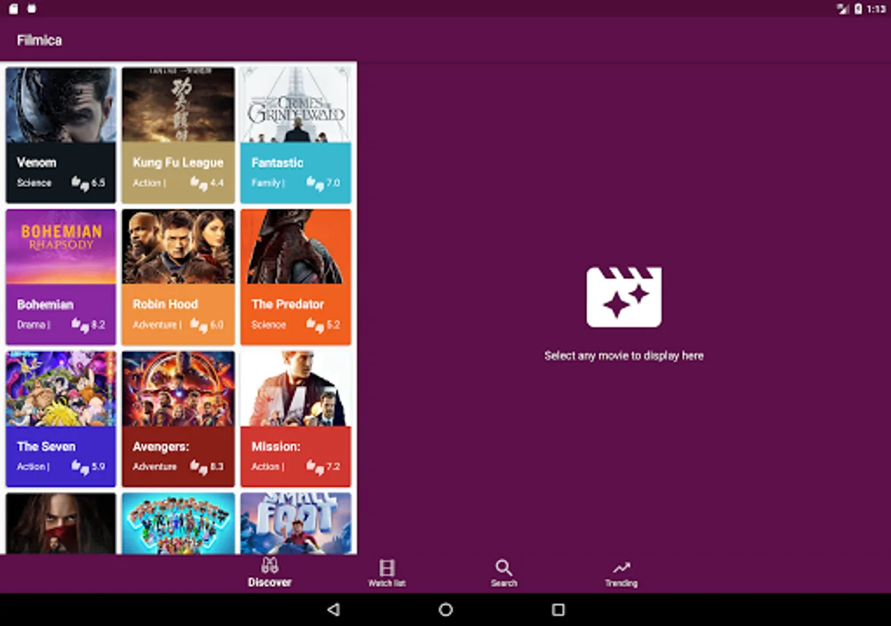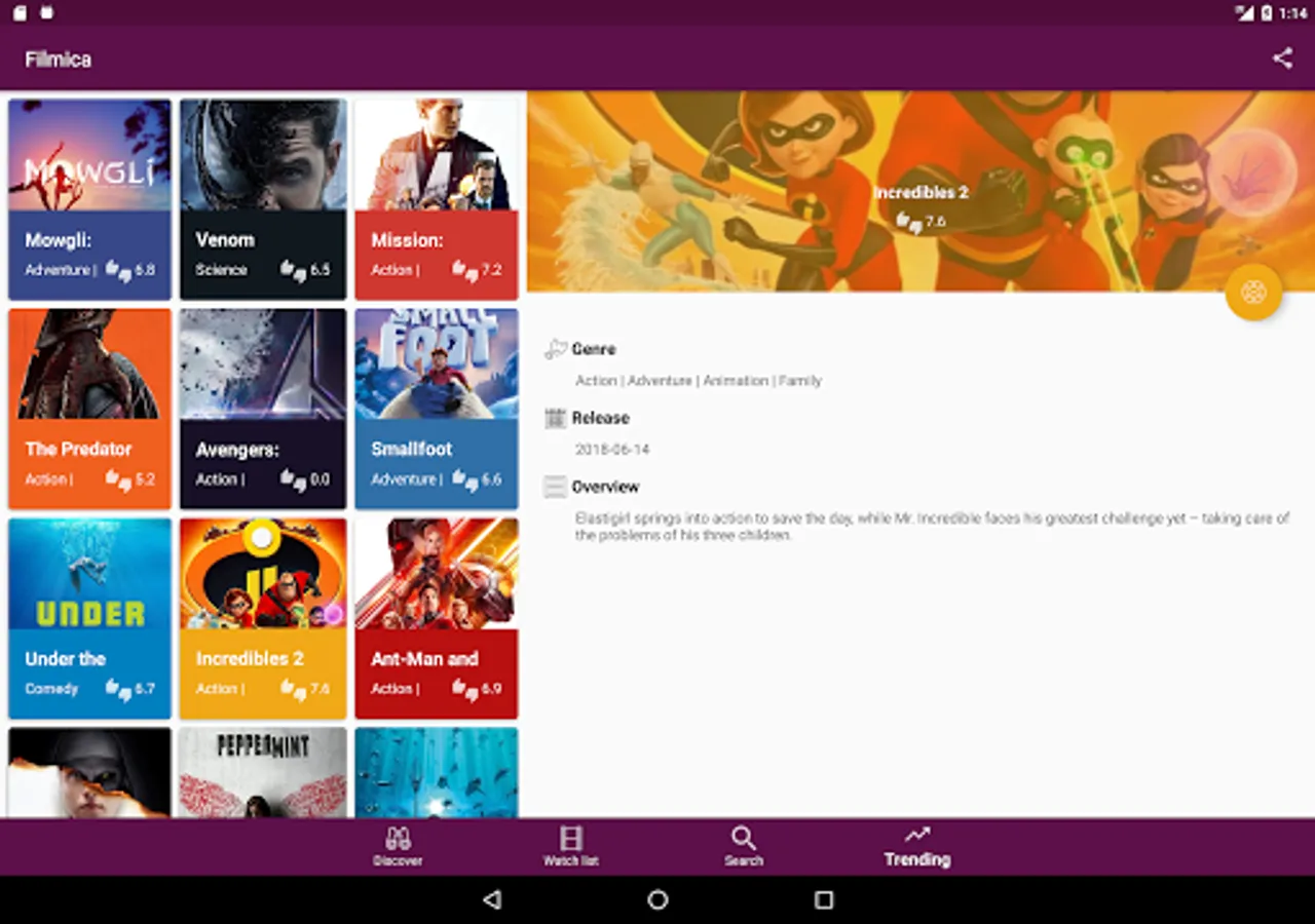 Filmica is an app where you can find the data of any movie you are looking for. It has sections such as Searching and Trending where you can find the most requested movies. In addition, you can save your favorite movies in a list to access later.