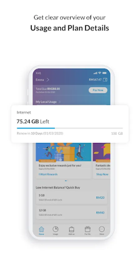 • Usage details: Check Internet, calls, SMS, and roaming usages