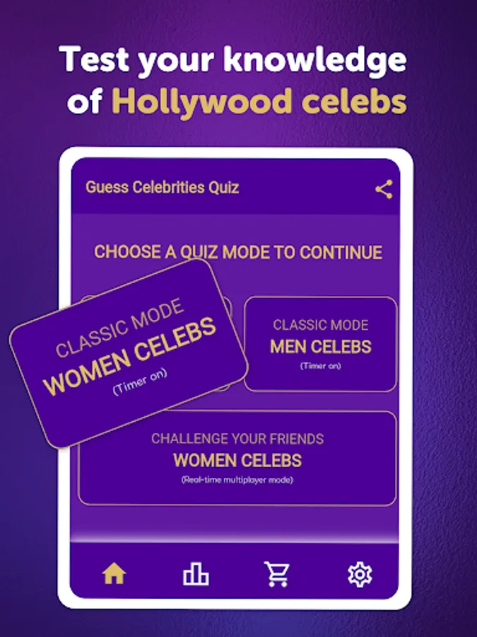 ‣ multiplayer quiz mode: challenge your friends with women's or men's celebs quiz
