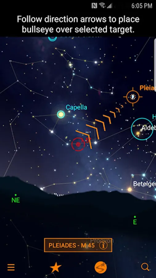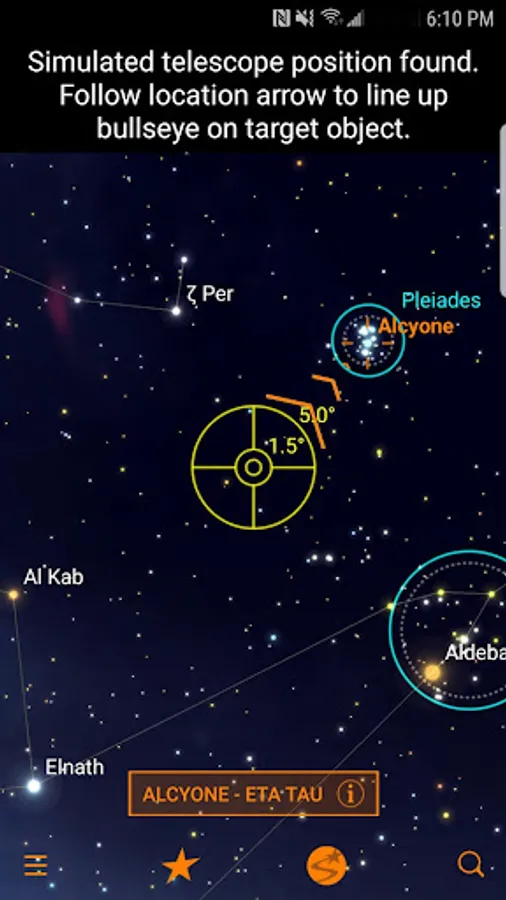 Once you select an object, the app displays pointing arrows onscreen. These indicate where to move the telescope to find it. Follow the arrows until the bullseye appears centered on target. When the bullseye turns green, the object is visible in the telescope’s lower powered eyepiece.