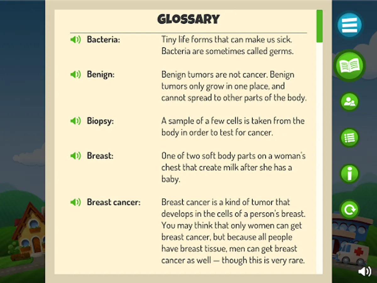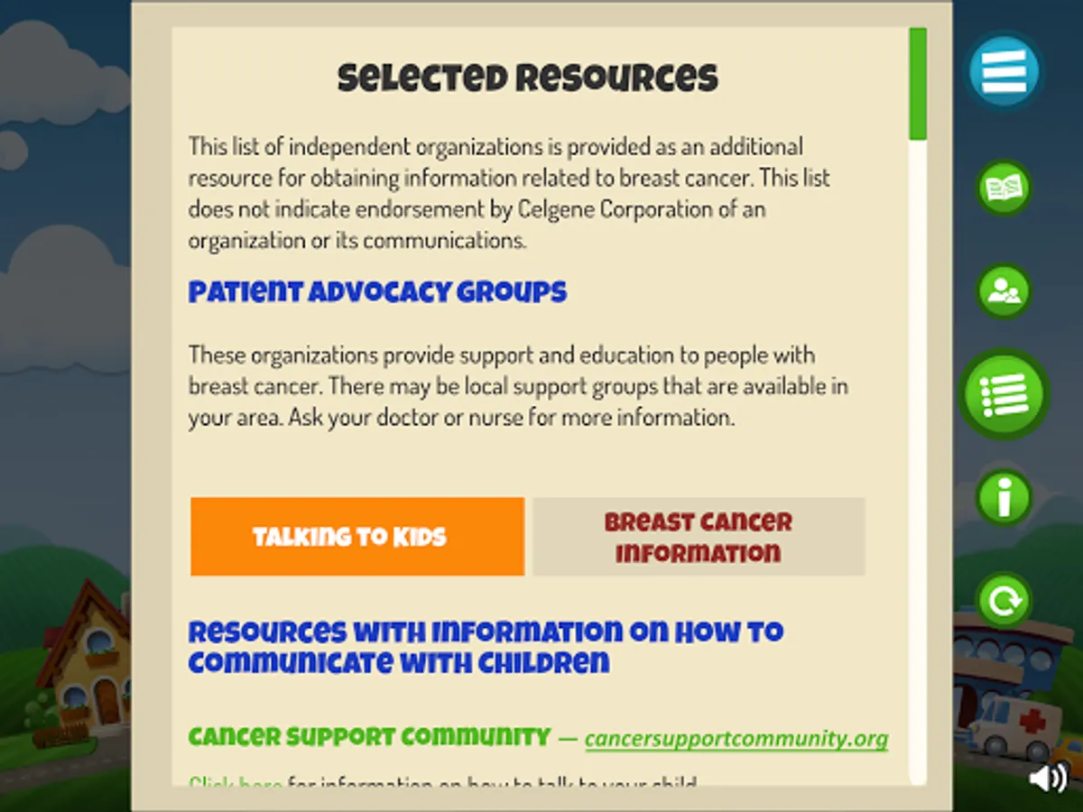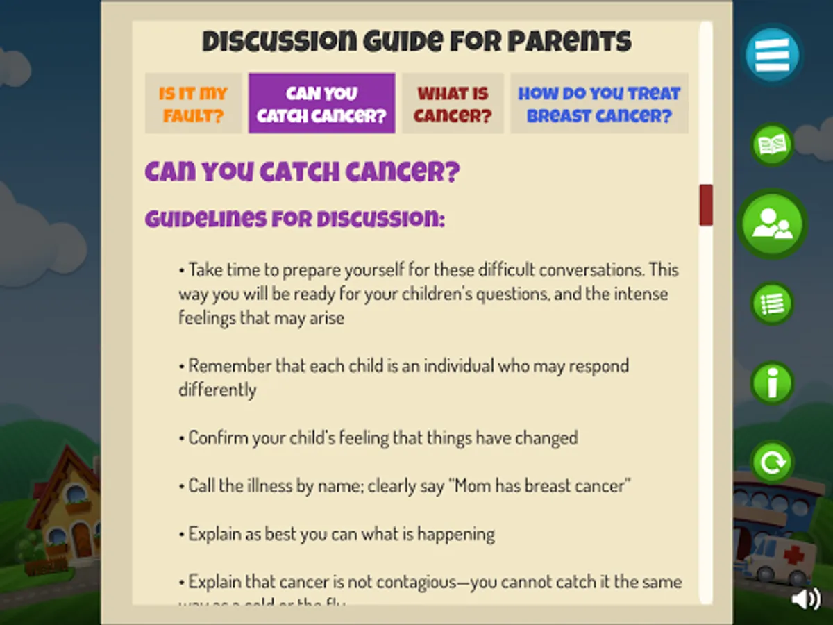 The Magic Tree is an app created specifically for children ages 5-8 who have a mother with breast cancer. Developed by Celgene, with input from patient advocacy groups and experts in breast cancer, the Magic Tree, through animated videos, explains in an age-appropriate way what cancer is, how it affects the body, and provides an overview of the treatments for breast cancer, including chemotherapy, radiation, and surgery. Each time a child watches a video or plays one of the games, they receive a decoration for their tree. The Magic Tree emphasizes that cancer is not the child’s fault, it encourages kids to ask questions, and also provides guidelines for parents to have a family discussion about breast cancer.