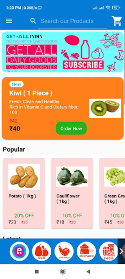 Get All India is a local delivery app where you get daily use products at price lower than market and other apps. Shop online for Grocery, Fresh Fruits and vegetables, Beauty and Hygiene, bakery, Bevarages & icecreams, Household & cleaning products, Kitchen, Baby care, Patanjali products, Sweets and other.