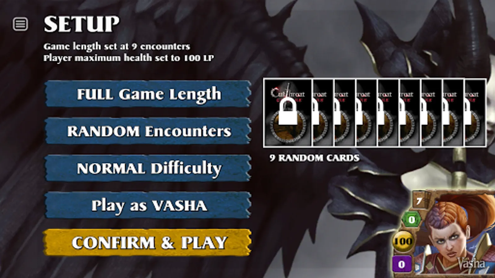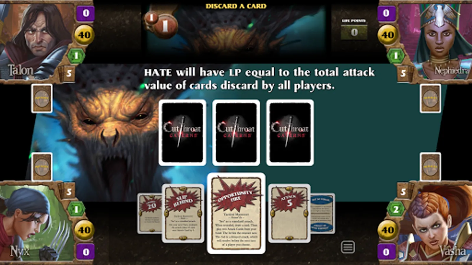 This digital version of Cutthroat Caverns has been optimized for solo play against 3 AI opponents, selected from a pool of 6 unique AI constructs. Each AI has their own tactics and strategies, which mirror the play styles that have emerged in the twelve years since the physical card game debuted. Players may choose a short 3 encounters, medium 5-encounter game or the traditional 9-encounter game – and may adjust the difficulty for a greater challenge. Unlock achievements as you progress through the game as you face off against the characters you know and love from the original Cutthroat Caverns.