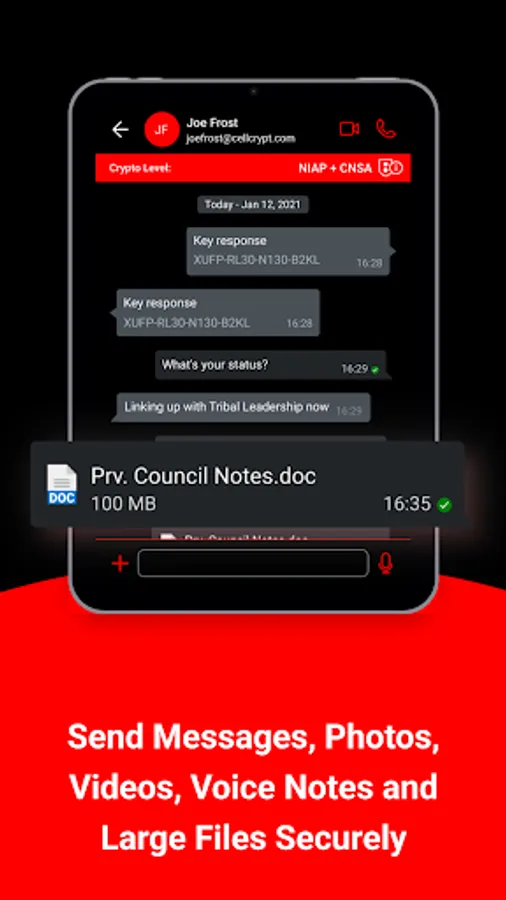 Obsidian Ghost Federal provides secure instant messaging with the ability to send photos, videos, voice notes, and large files of any kind. All messages and files are end-to-end encrypted with a new key generated for every message or file sent. Obsidian Ghost Federal’s enhanced Data at Rest encryption protects all files and media stored within the app.