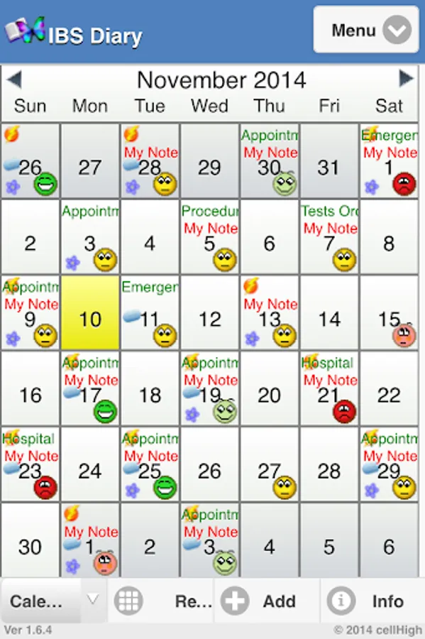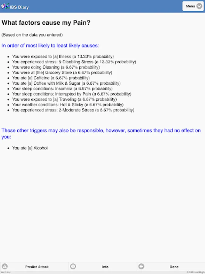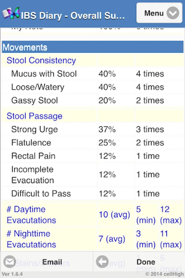 Are you like one of the millions of people who have IBS? How can IBS Diary help? IBS Diary was designed to track information about your IBS with a few screen taps. Using this information, the application will allow you to use triggers, like your stress, sleep and weather patterns, day of week, and diet, to predict and manage your IBS Pain and Symptoms. IBS has a new “Trending and Forecasting” module that shows you which factors and triggers contribute to your pain and symptoms. This will help you feel better and will allow you to take control of your IBS. IBS Diary makes it easy to perform tasks like tracking your treatment progress, graphing your patterns, emailing reports, including graphical attachments to your doctor and advisors. IBS Diary will also allow you to export your data to a spread sheet all with just a few screen taps. Do you want all of your IBS health records and information at your fingertips so that you can start feeling better. IBS Diary can help.
