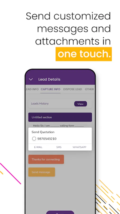 Build pre-defined templates and customizable telecalling scripts. Get SMS and WhatsApp automation and send instant messages to your customers - all without saving any contact information!