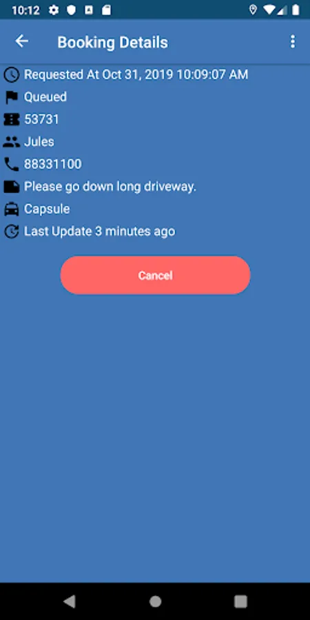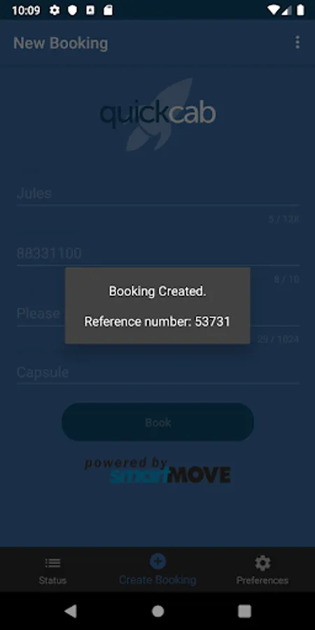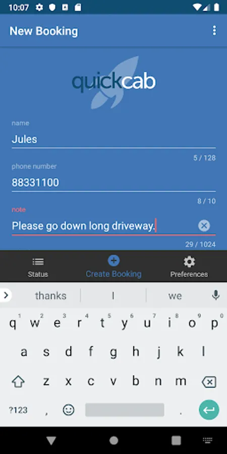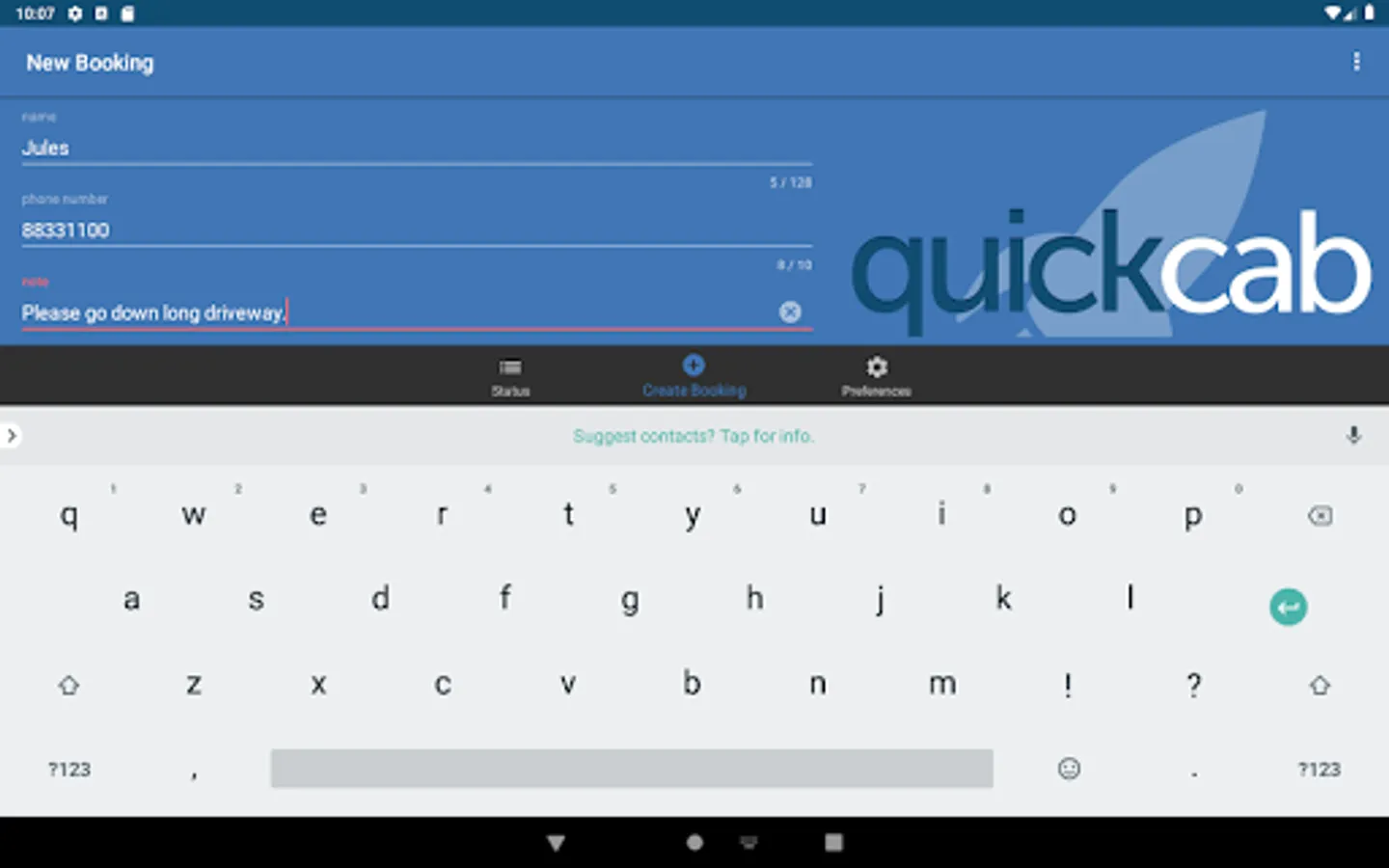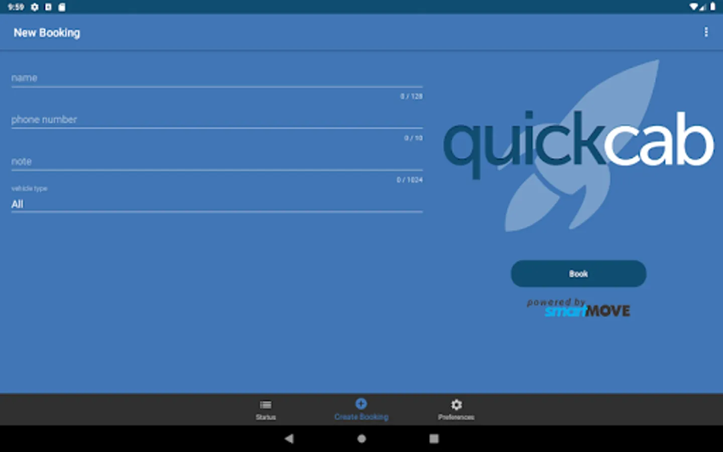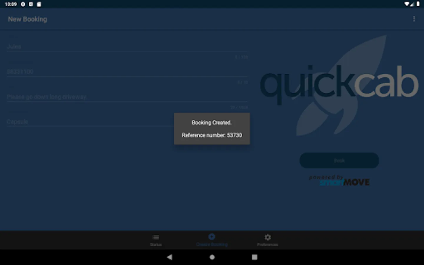When using QuickCab a name, phone number, driver note may be supplied and a vehicle type can be specified. However the pick-up location is fixed and the booking is always for a vehicle as soon as possible. It is not possible to pre-book a vehicle for a time in the future using QuickCab.
