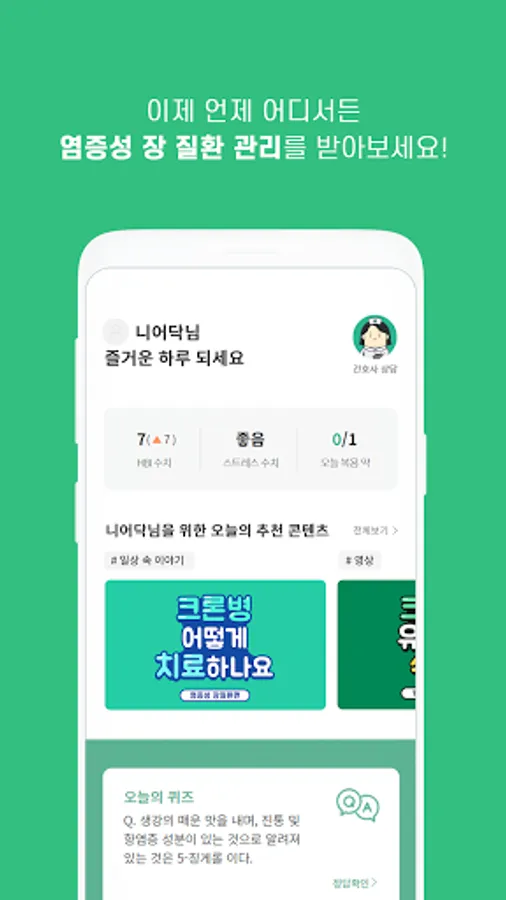 Since it is a disease that requires lifelong symptom control and management, try managing symptoms and quality of life easily and conveniently with NearDoc, an inflammatory bowel disease management app.