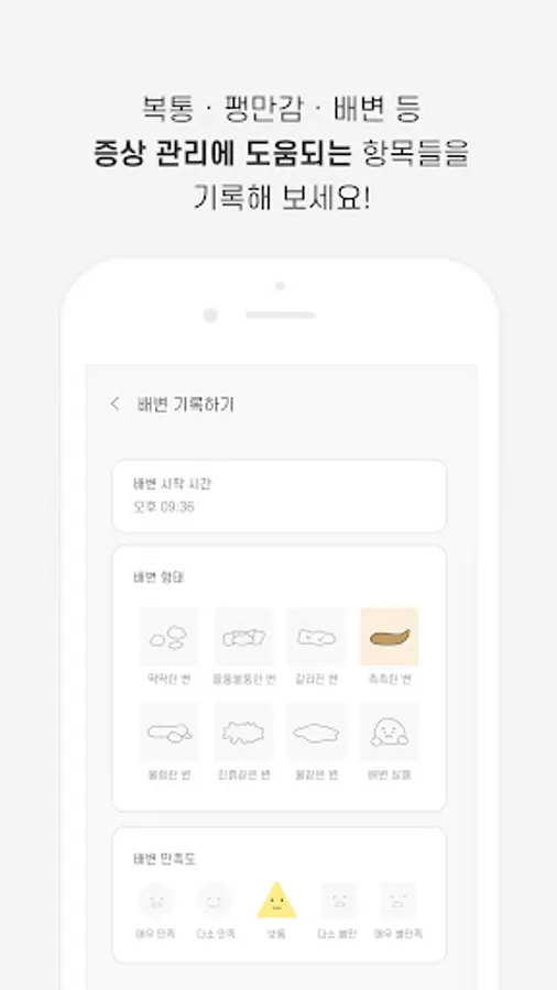 You can enter bowel movement type, satisfaction level, color, and sense of urgency. Record meticulously for my healthy bowel movement management!