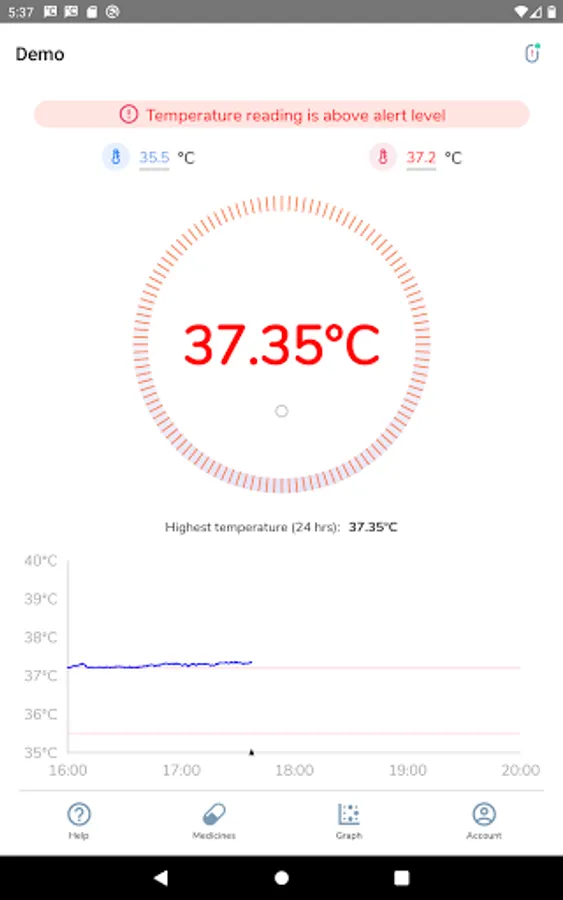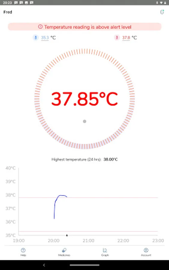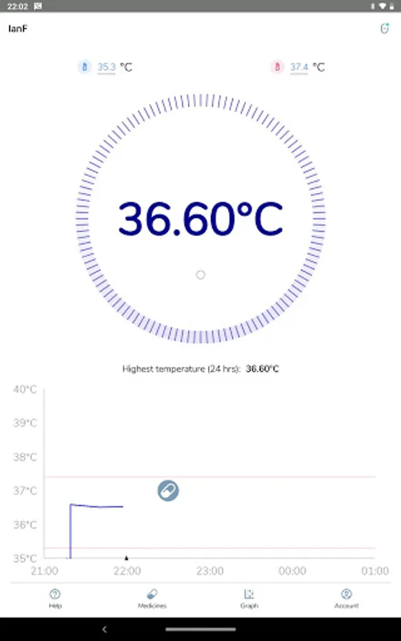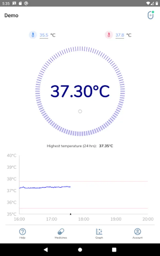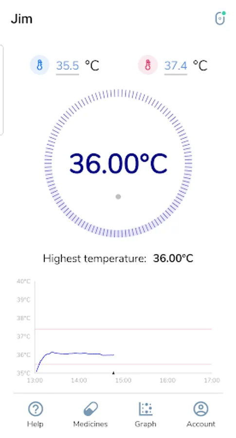 - The sensor sends a body temperature reading to the app every 4s. You can see this on the readout dial.