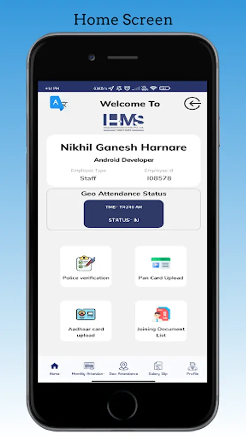 IHMS-R Android App is for employee this app tracks the real time location of the employee and allow them to mark their attendance by capturing their image.