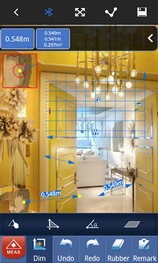 Users use Meterbox iLDM Pro software and start photographed function, take photos of scenes that needed, meanwhile real time transport the measured data to mobile phone through Bluetooth from laser distance meter, and display on the scene pictures. Users can use the software’s edit function to mark the measured data on the scene pictures, so that to become scene figures. Scene figures can be saved in mobile phone or share with others via email/facebook/twitter/microblog. Therefore greatly convenient to daily purchase of curtain in suitable size, and reasonable decorate household furniture sample figure can show to families who are far away.