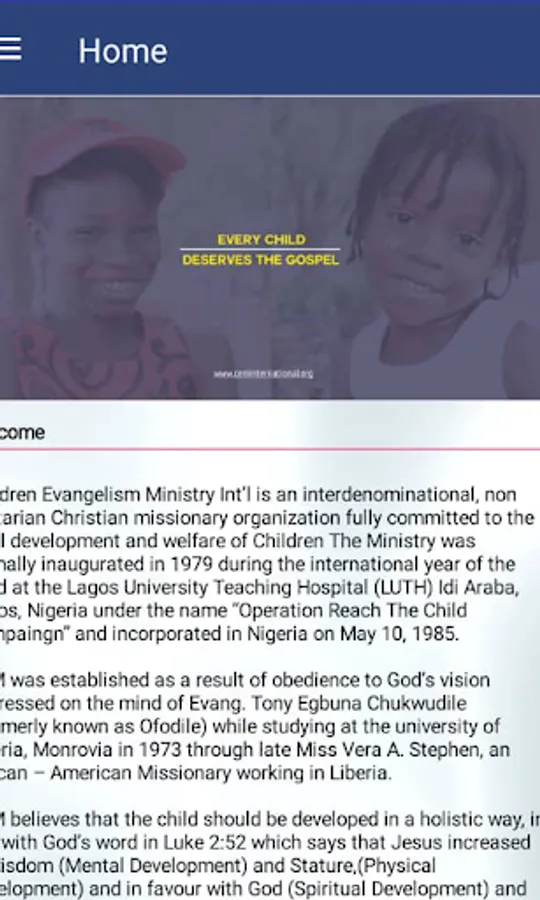 Children Evangelism Ministry Int’l is an interdenominational, non sectarian Christian missionary organization fully committed to the total development and welfare of Children The Ministry was formally inaugurated in 1979 during the international year of the child at the Lagos University Teaching Hospital (LUTH) Idi Araba, Lagos, Nigeria under the name “Operation Reach The Child Campaign” and incorporated in Nigeria on May 10, 1985.