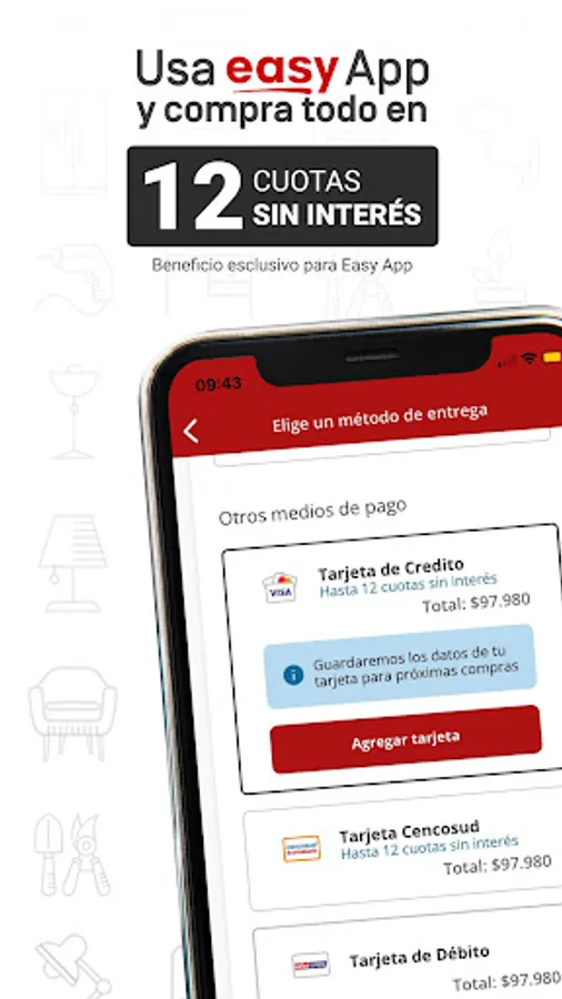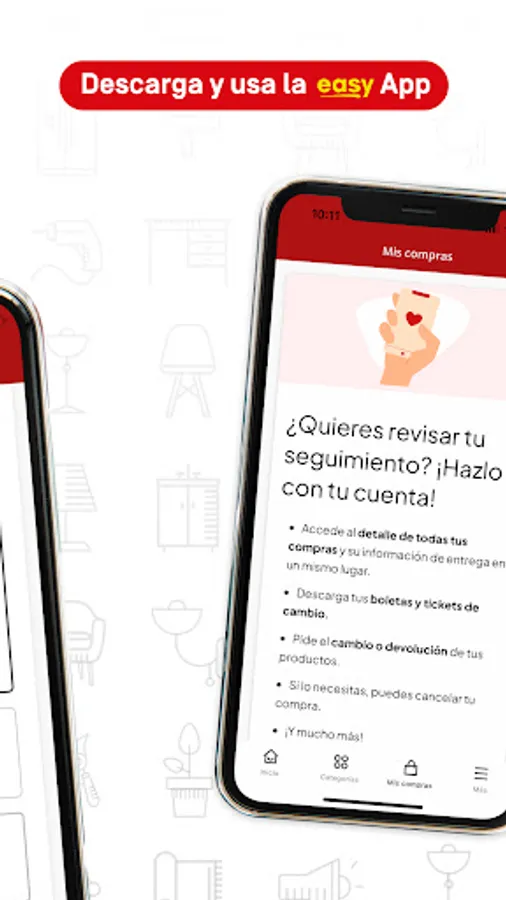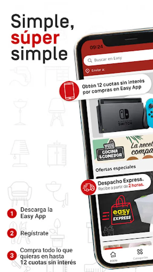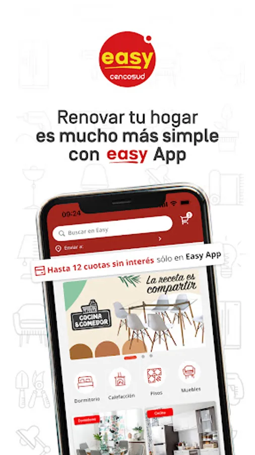 Discover the new Easy App where you can find the best products to renovate your home, always the best brands to renovate your furniture, floors, paints, bedroom, decoration and lighting, tools, outdoor products to enjoy the outdoors, and everything that you can imagine.