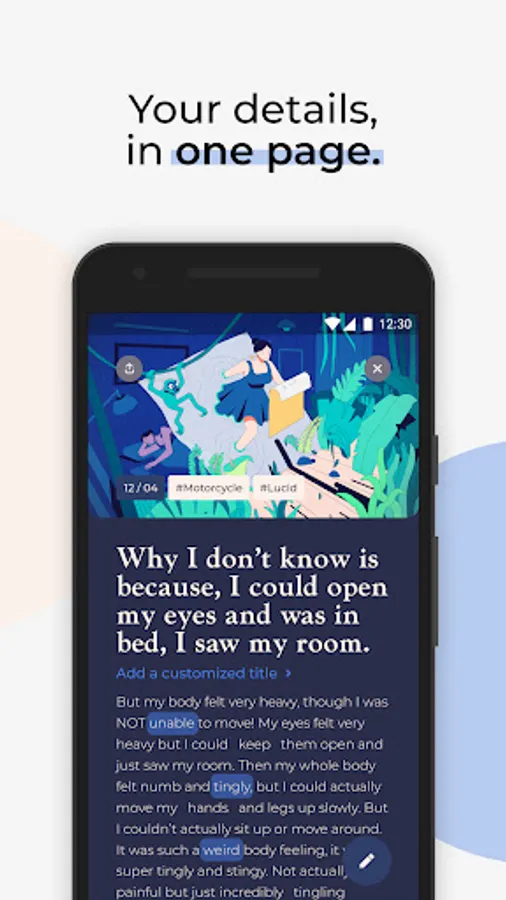 - Dream Journal Storage: You can store dreams on your own Dream Journal which will be shared across all your devices.
