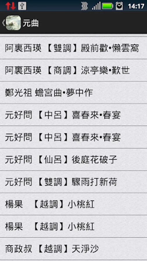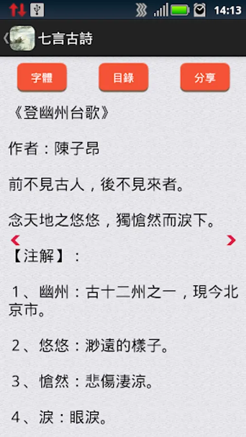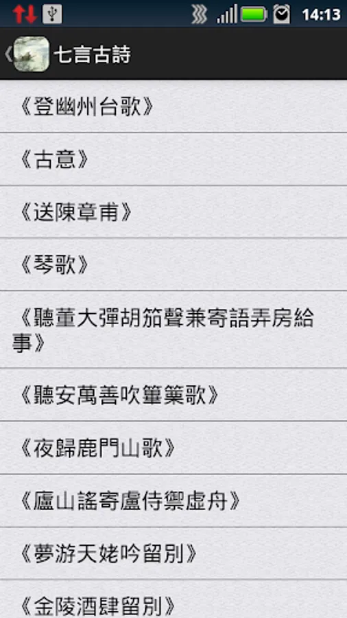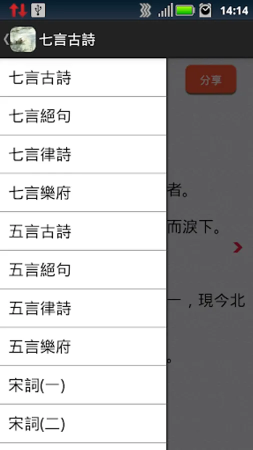 A detailed classification of the APP includes the following categories: Seven Poems, Seven quatrains, Seven Poems, Seven Yue, Wu Yan poetry, Wu Yan quatrains, Wu Yan verses, Wu Yan Yue, Song (a), Song (two ), the famous and the Yuan Dynasty;