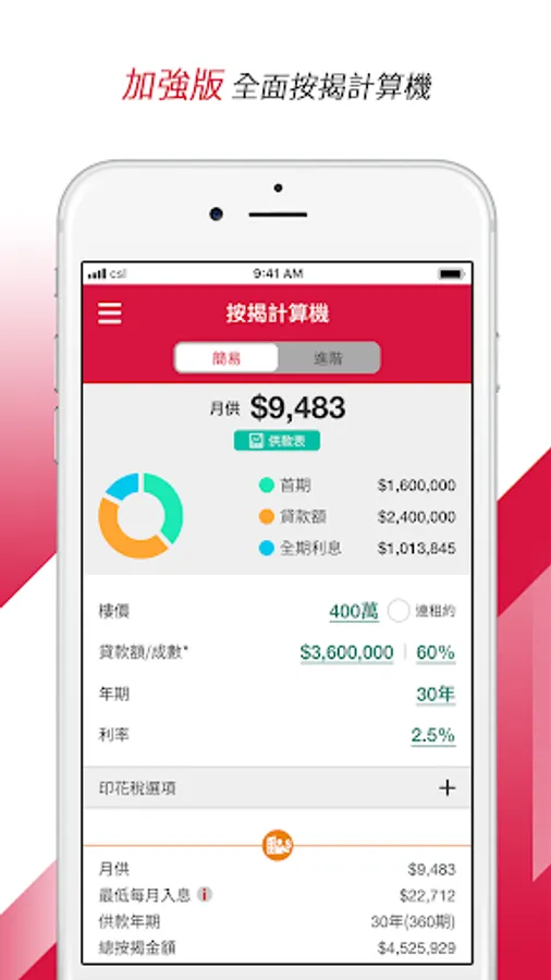 按揭計算機 - 您可利用功能全面的計算機自由輸入樓價、按揭成數、供款年期、利率等資料,即可計算出首期、每月供款、利息,並緊貼最新政府樓按措施,以及提供按揭保費計算,助您輕鬆計劃置業財務安排,方便易用。