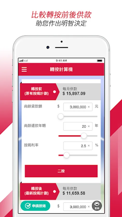轉按計算機 - 即時比較轉按前後的每月供款及套現金額,一目了然。